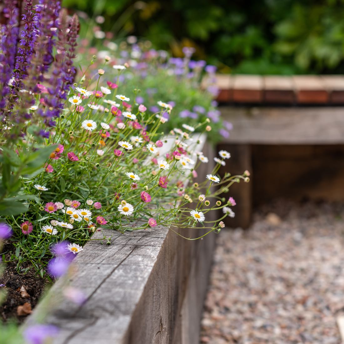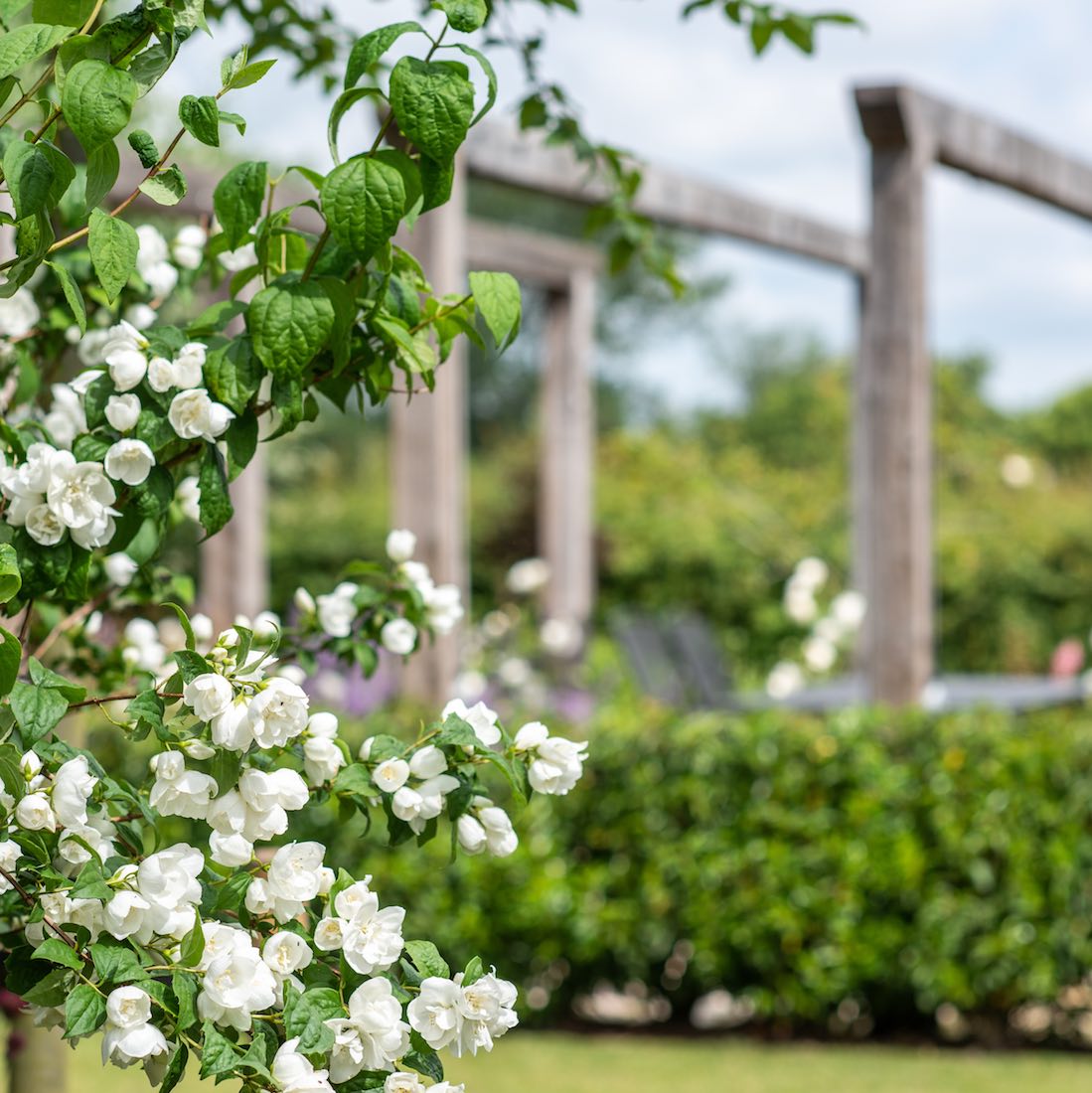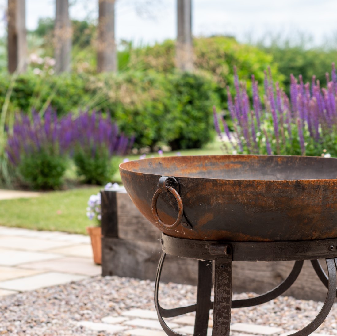 The solution was to create a new dining area with large oak pergola spanning the paving. This required some very large oak beams but this gave the area a fantastic room like feel, with a structure to grow climbing roses. A second more relaxed fire pit and lounging area was created with an oak and western red cedar bench, with a log store below. A range of new planting beds were introduced to give additional colour and help soften the red brick of the house which dominated the view from the garden. New planting was interspersed with existing shrubs, and three ‘Box head’ Hornbeam trees add height and focus views on the fields beyond. As a finishing touch, lighting was added to highlight key features in the garden, all controlled by remote control from the house.